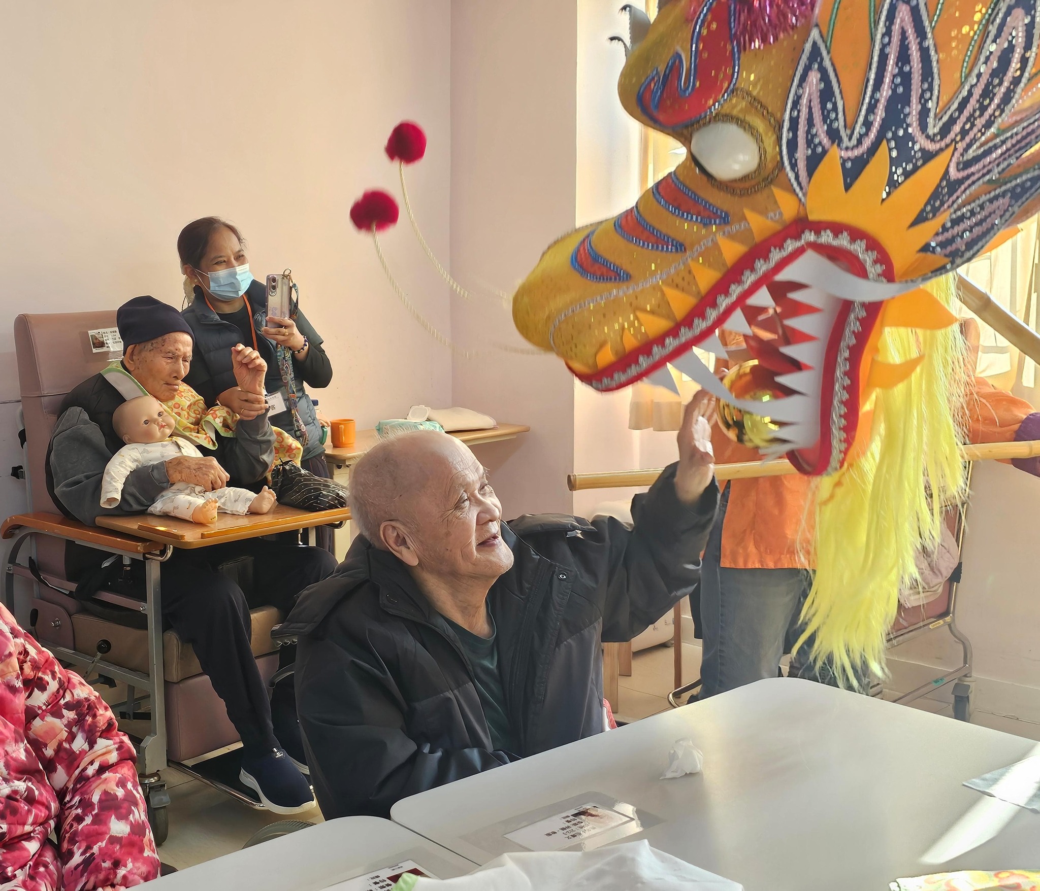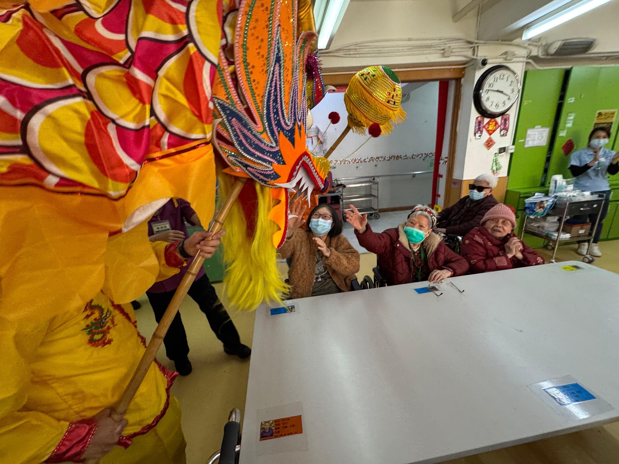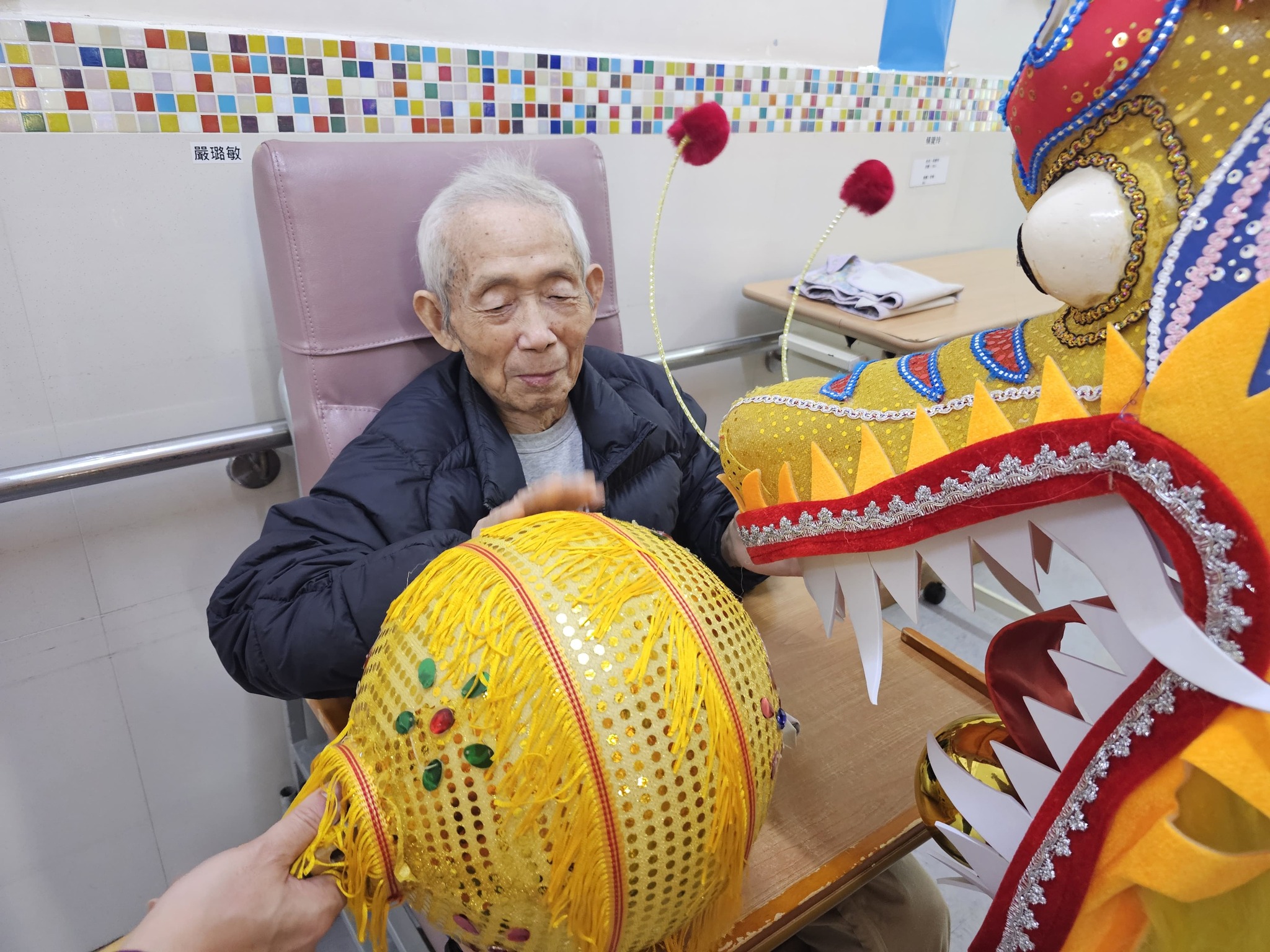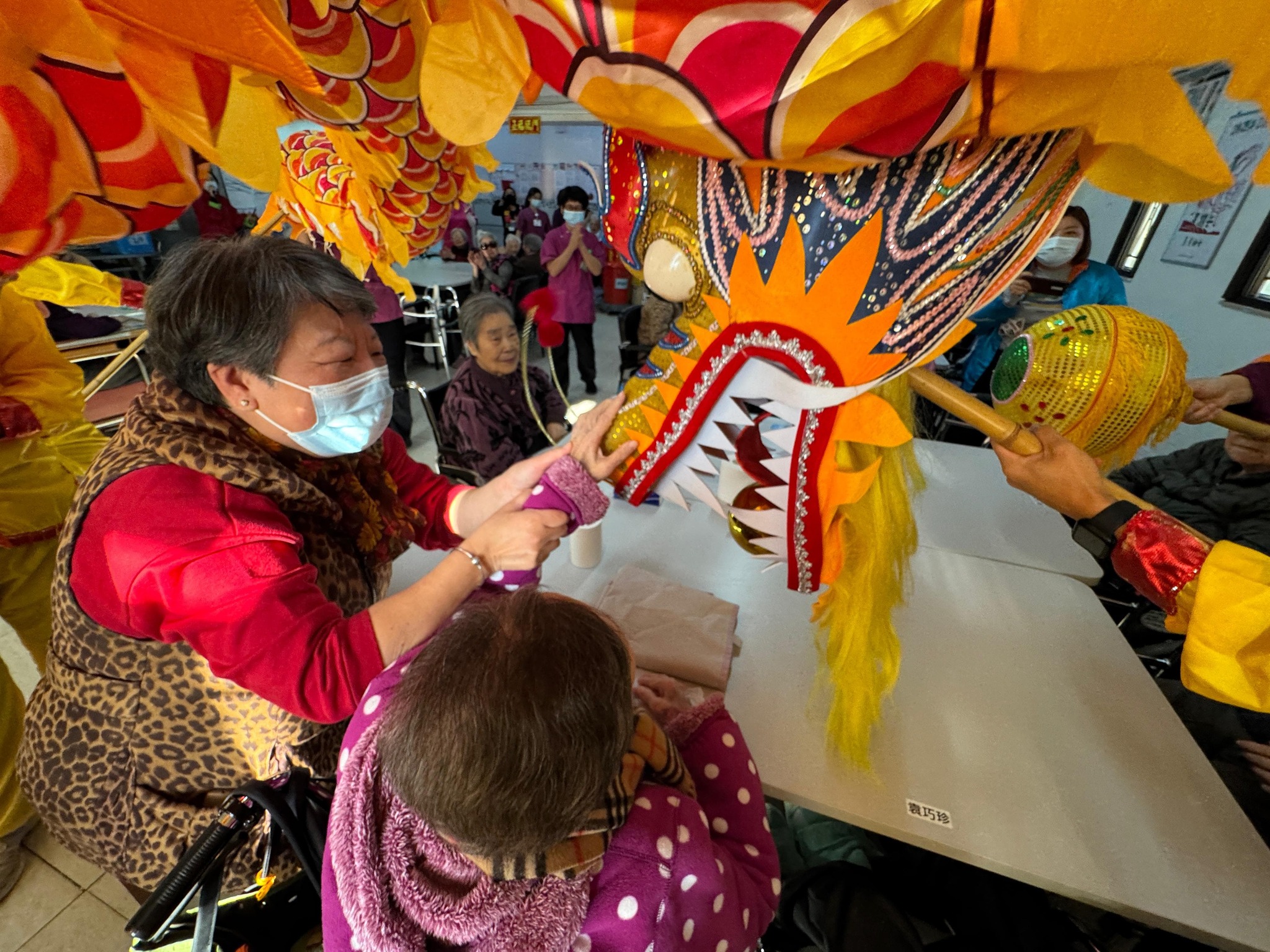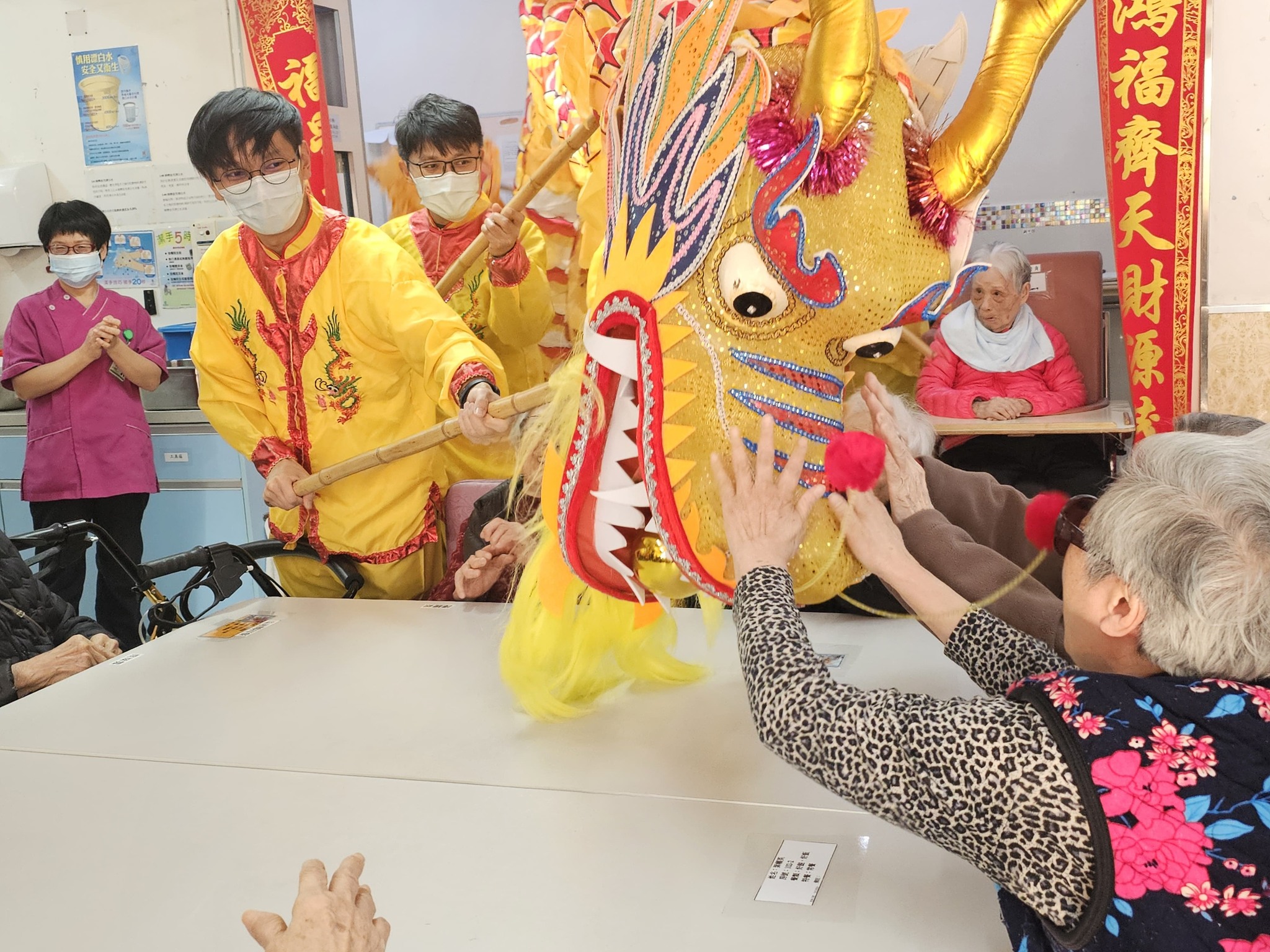 金狂舞春添彩,玉樹臨風喜滿門 農曆新年期間,本院職員親身上陣為長輩進行舞龍表演 金黃色的長龍在陣陣鏗鏘有力的樂聲襯托下,在樓層內翻騰起舞,神態威武且動作多變,長輩們都紛紛伸手摸摸龍頭、摸摸龍身,盼望來年風調雨順、如意吉祥
