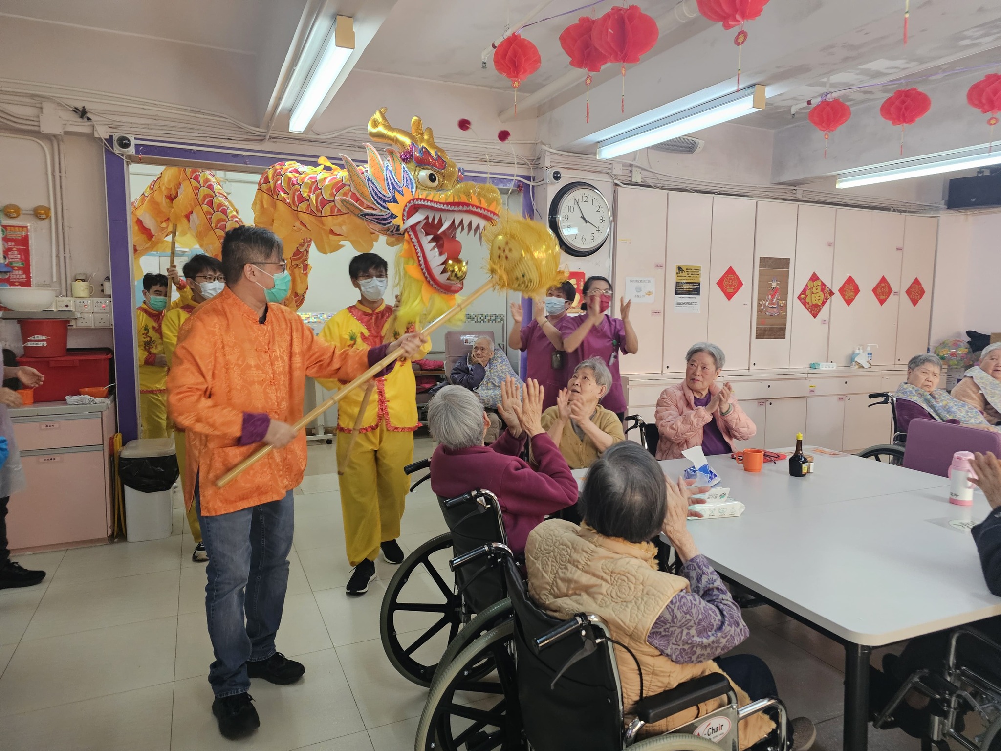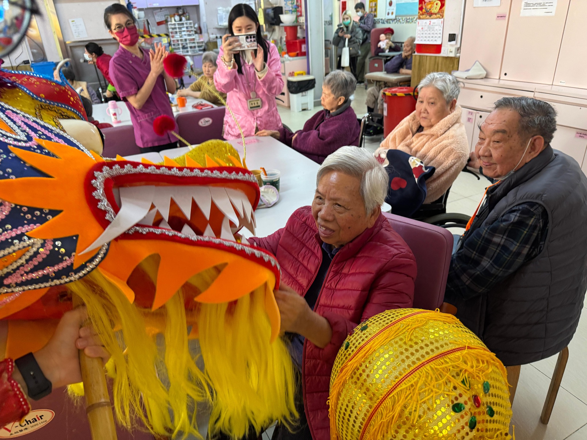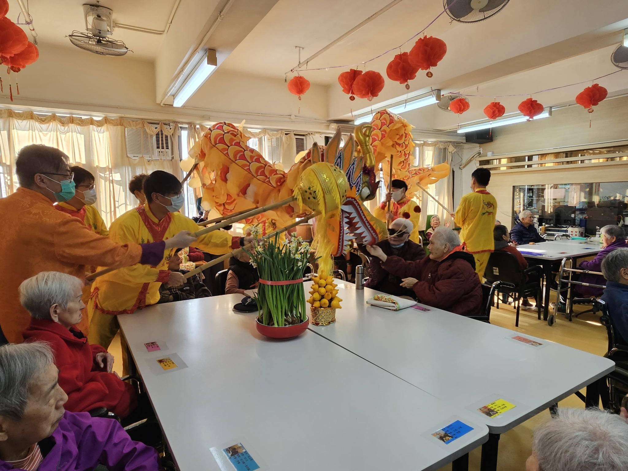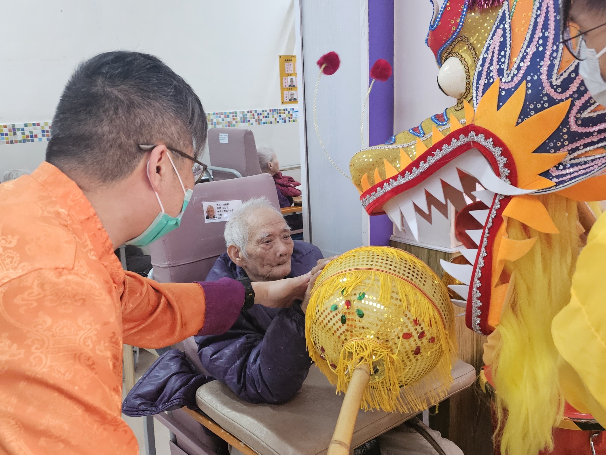 金狂舞春添彩,玉樹臨風喜滿門 農曆新年期間,本院職員親身上陣為長輩進行舞龍表演 金黃色的長龍在陣陣鏗鏘有力的樂聲襯托下,在樓層內翻騰起舞,神態威武且動作多變,長輩們都紛紛伸手摸摸龍頭、摸摸龍身,盼望來年風調雨順、如意吉祥