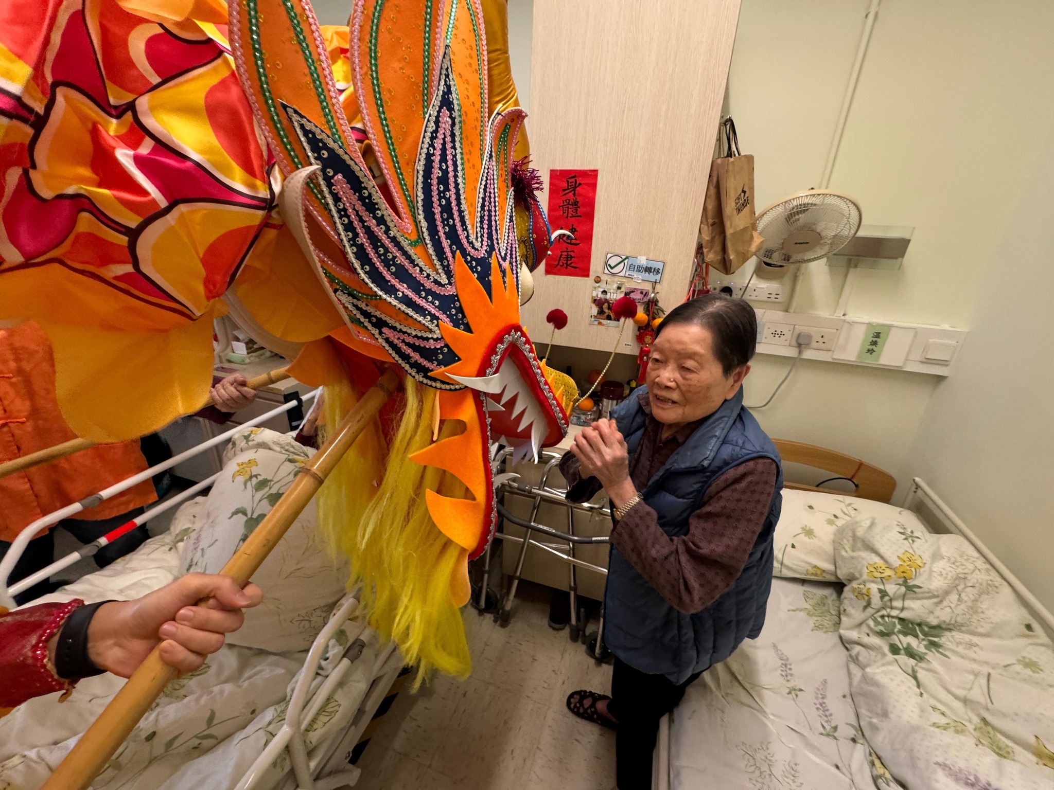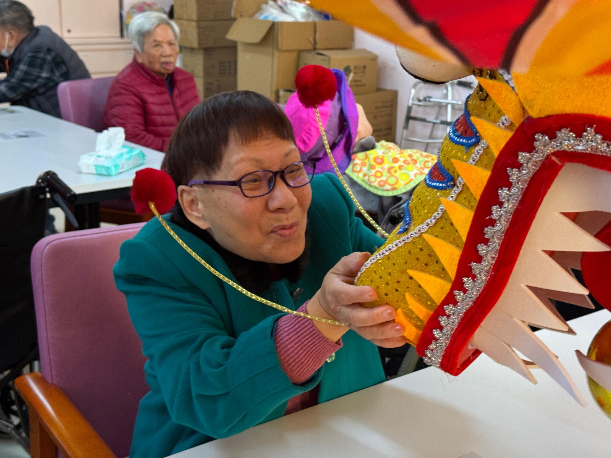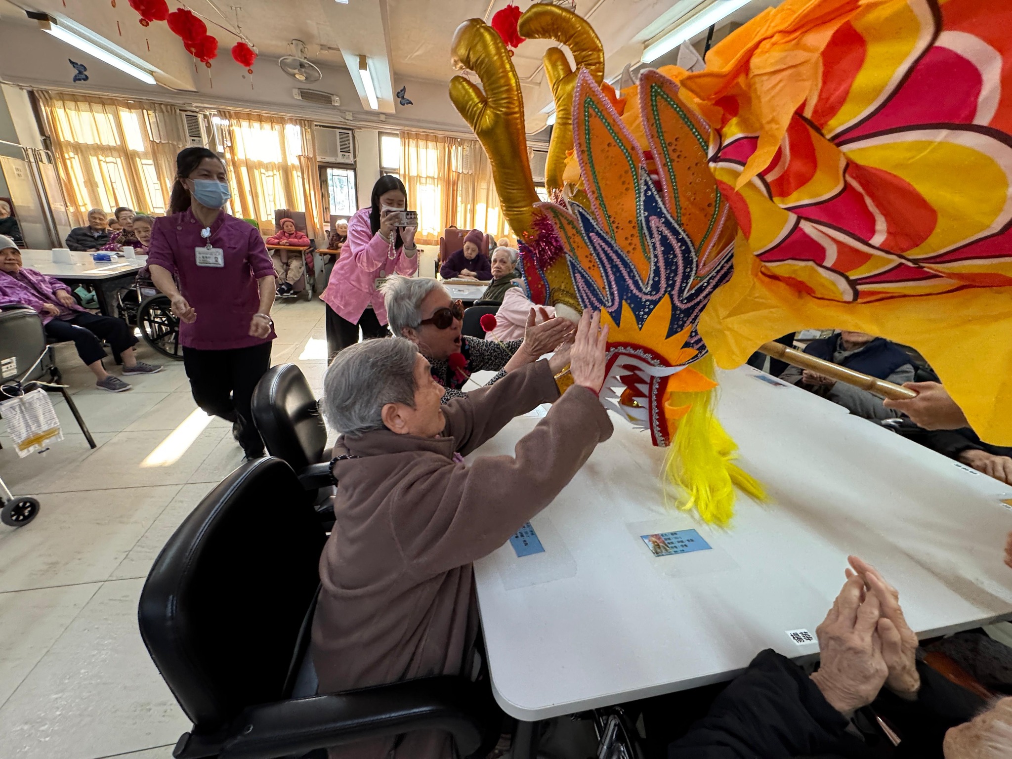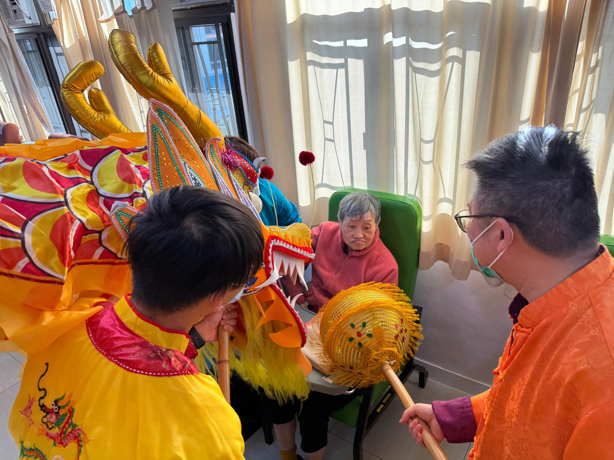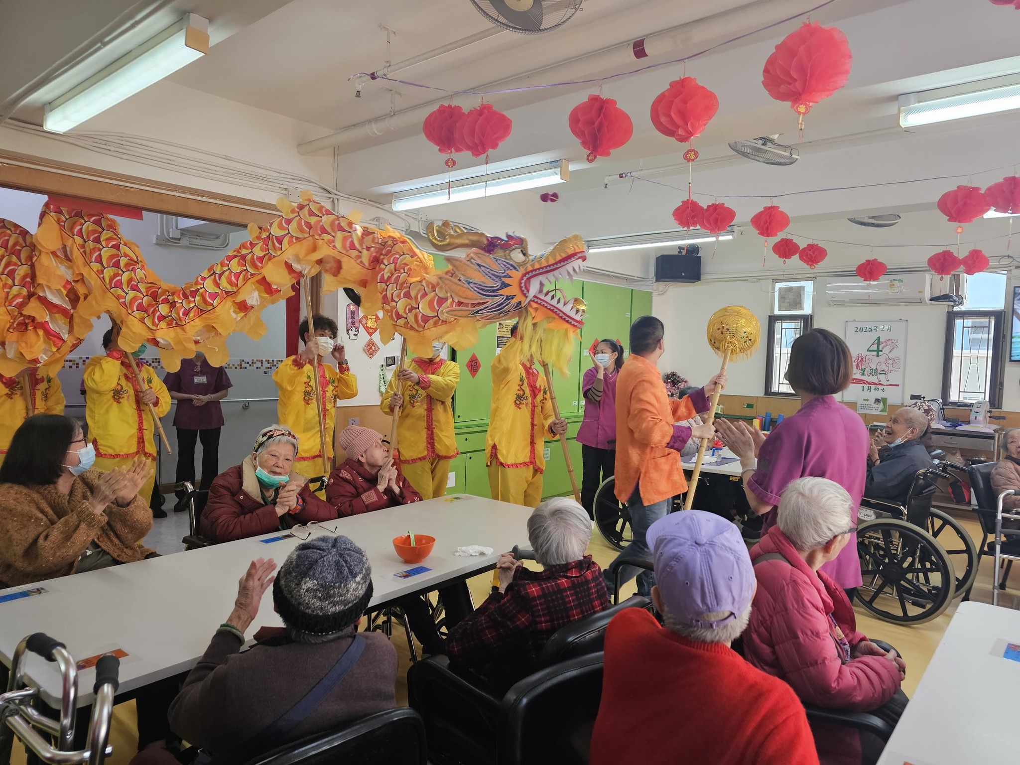 金狂舞春添彩,玉樹臨風喜滿門 農曆新年期間,本院職員親身上陣為長輩進行舞龍表演 金黃色的長龍在陣陣鏗鏘有力的樂聲襯托下,在樓層內翻騰起舞,神態威武且動作多變,長輩們都紛紛伸手摸摸龍頭、摸摸龍身,盼望來年風調雨順、如意吉祥