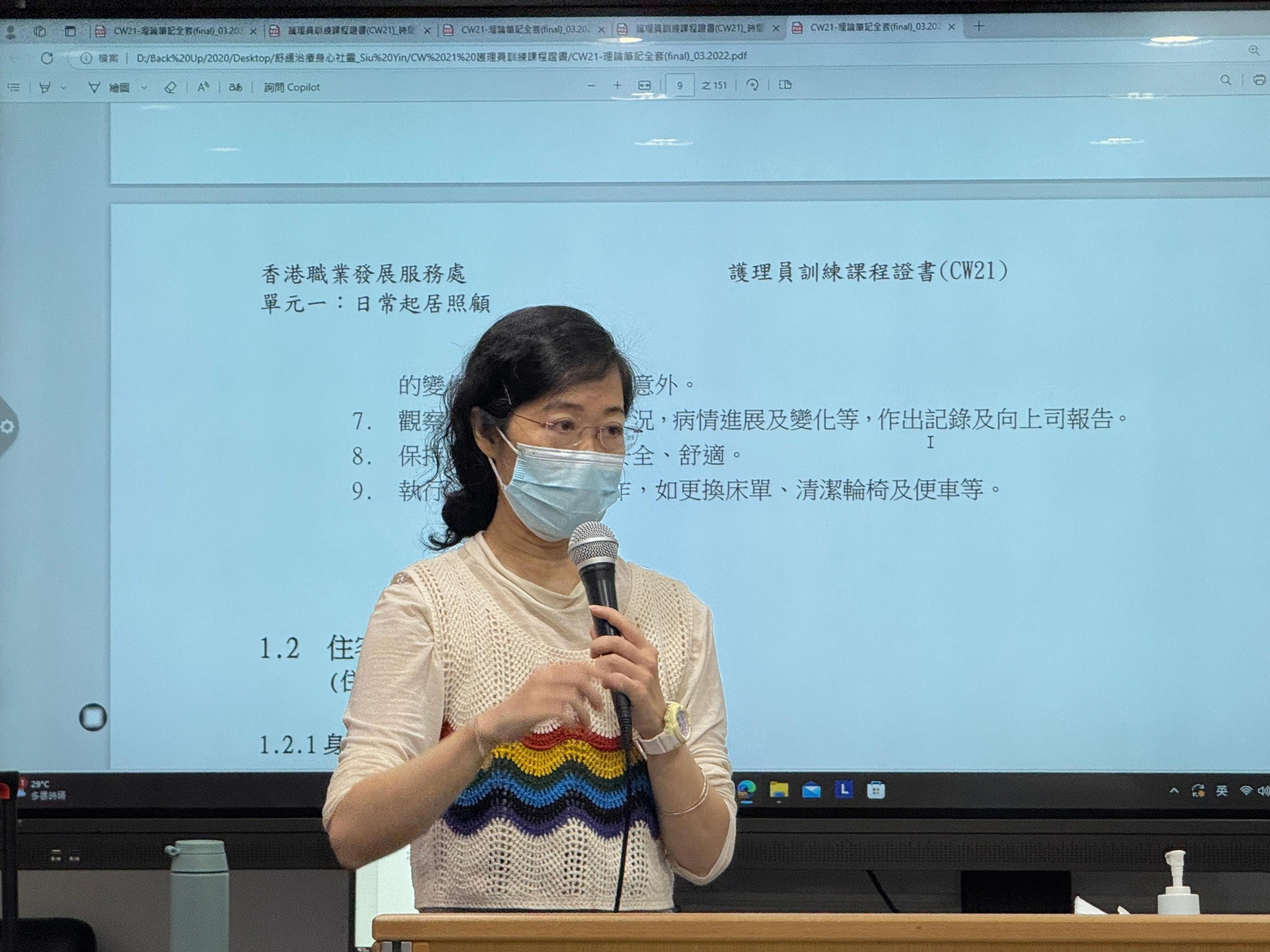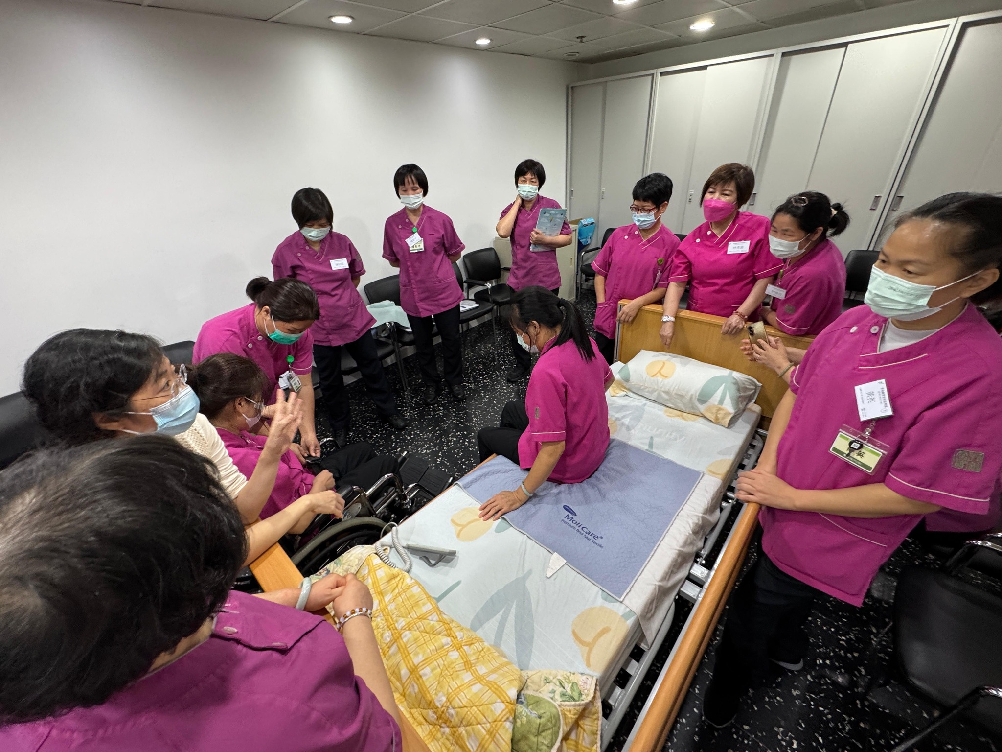 為持續提升本院的服務質素,我們邀請外間機構派員安排「護理員訓練證書課程」,讓職員溫故知新,從日常起居照顧、常見的口腔及足患問題、扶抱及轉移的手握法及與長輩及家人溝通技巧,使職員於日常照顧時能更貼切長輩所需,改善長輩在院舍的生活質素