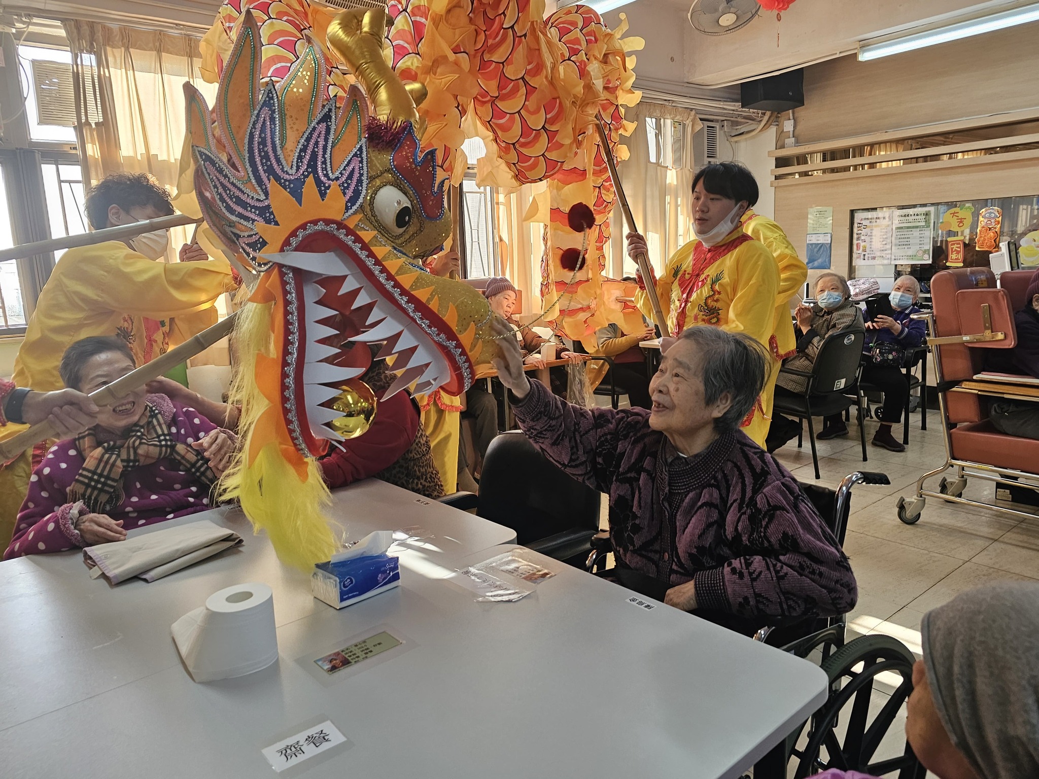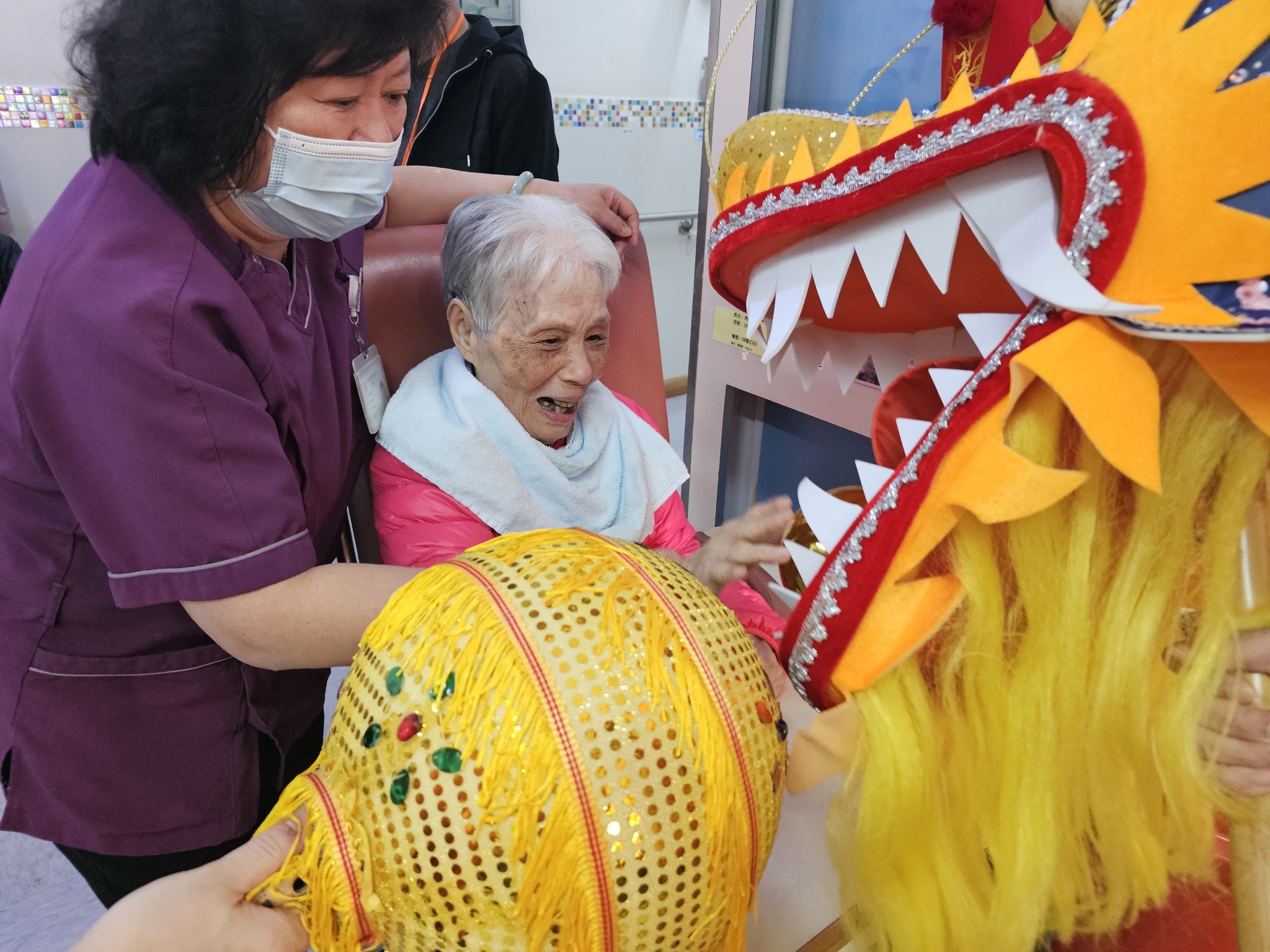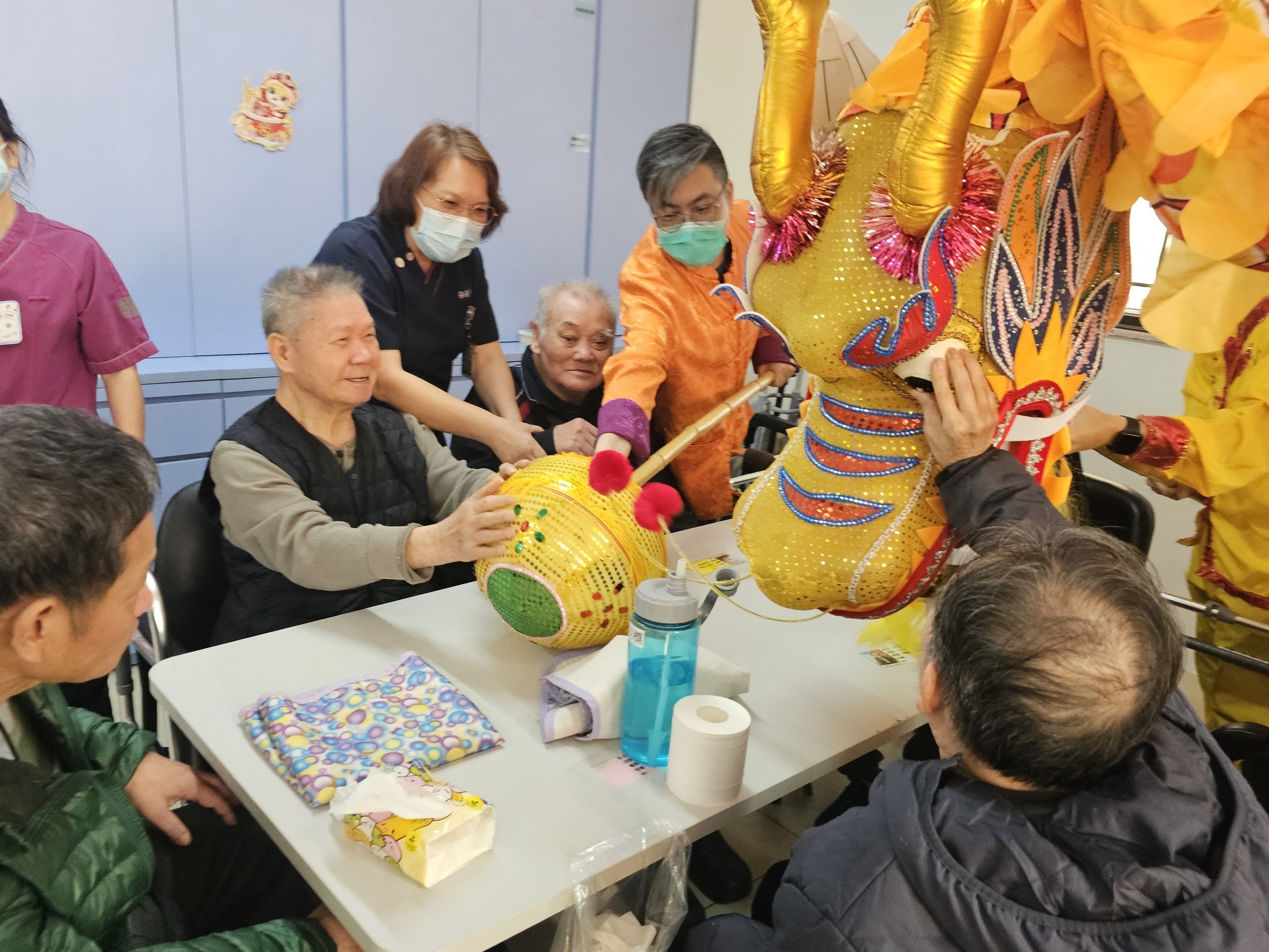 金狂舞春添彩,玉樹臨風喜滿門 農曆新年期間,本院職員親身上陣為長輩進行舞龍表演 金黃色的長龍在陣陣鏗鏘有力的樂聲襯托下,在樓層內翻騰起舞,神態威武且動作多變,長輩們都紛紛伸手摸摸龍頭、摸摸龍身,盼望來年風調雨順、如意吉祥