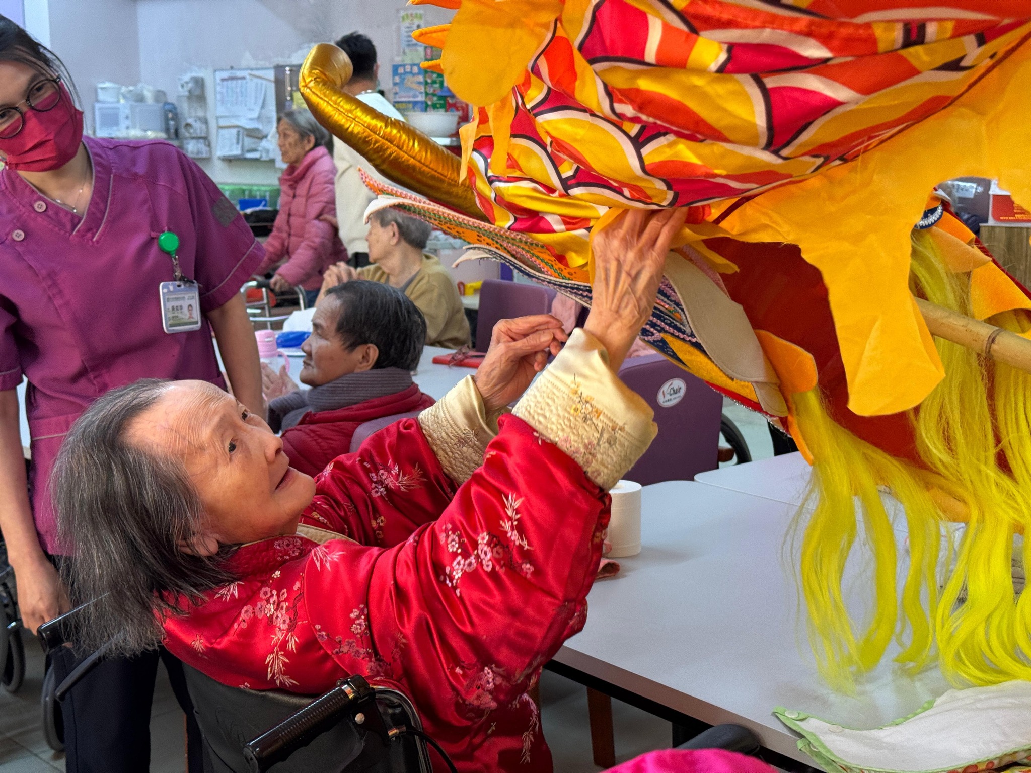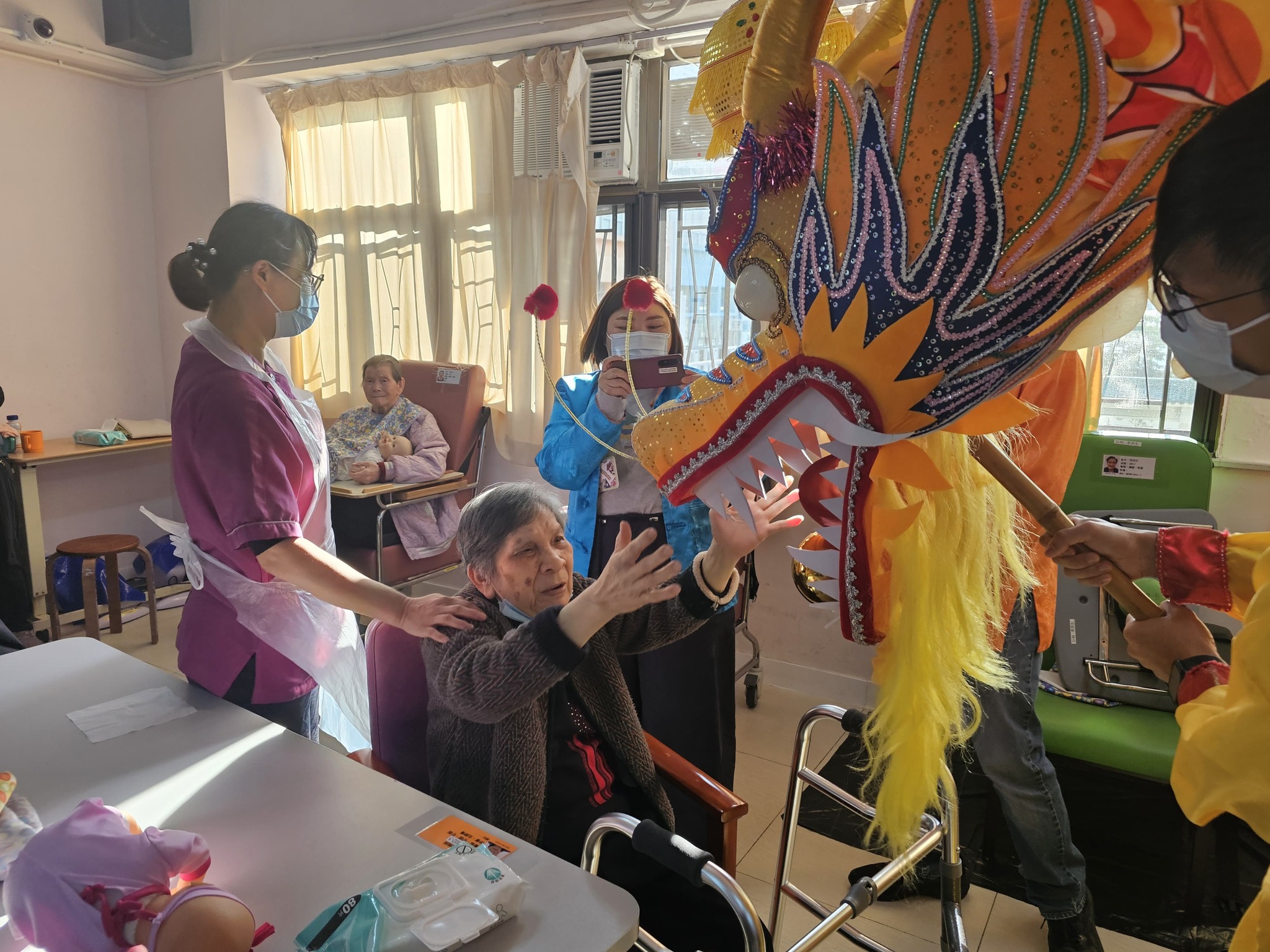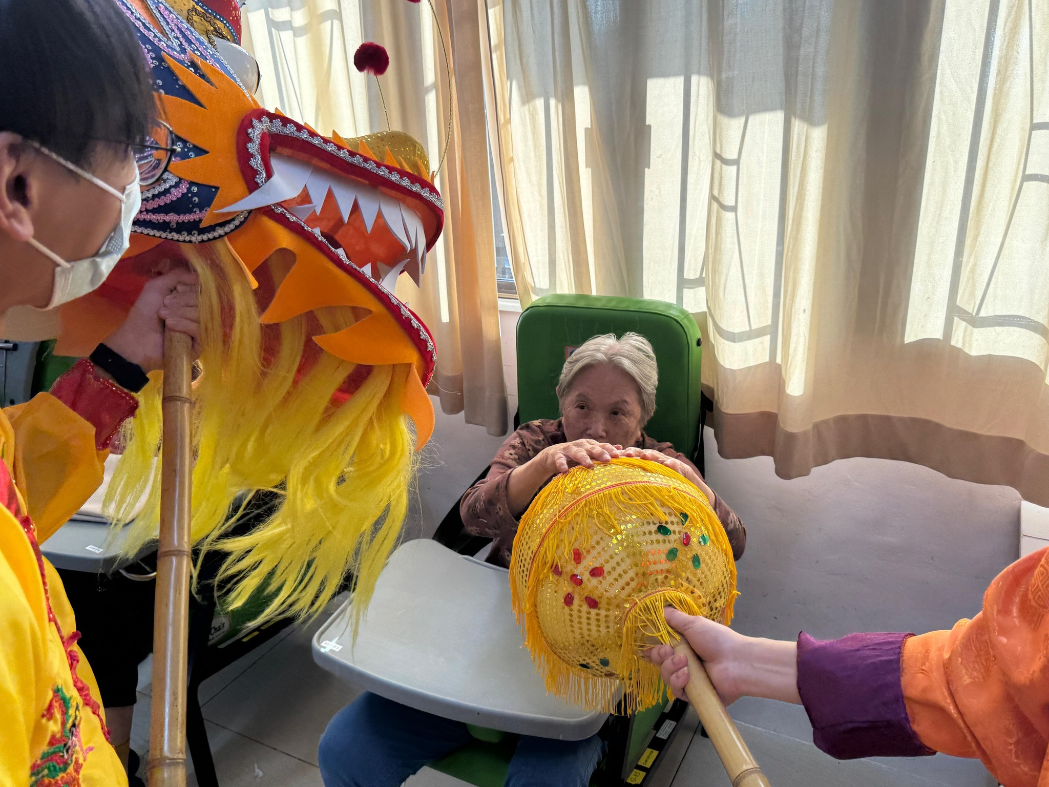 金狂舞春添彩,玉樹臨風喜滿門 農曆新年期間,本院職員親身上陣為長輩進行舞龍表演 金黃色的長龍在陣陣鏗鏘有力的樂聲襯托下,在樓層內翻騰起舞,神態威武且動作多變,長輩們都紛紛伸手摸摸龍頭、摸摸龍身,盼望來年風調雨順、如意吉祥