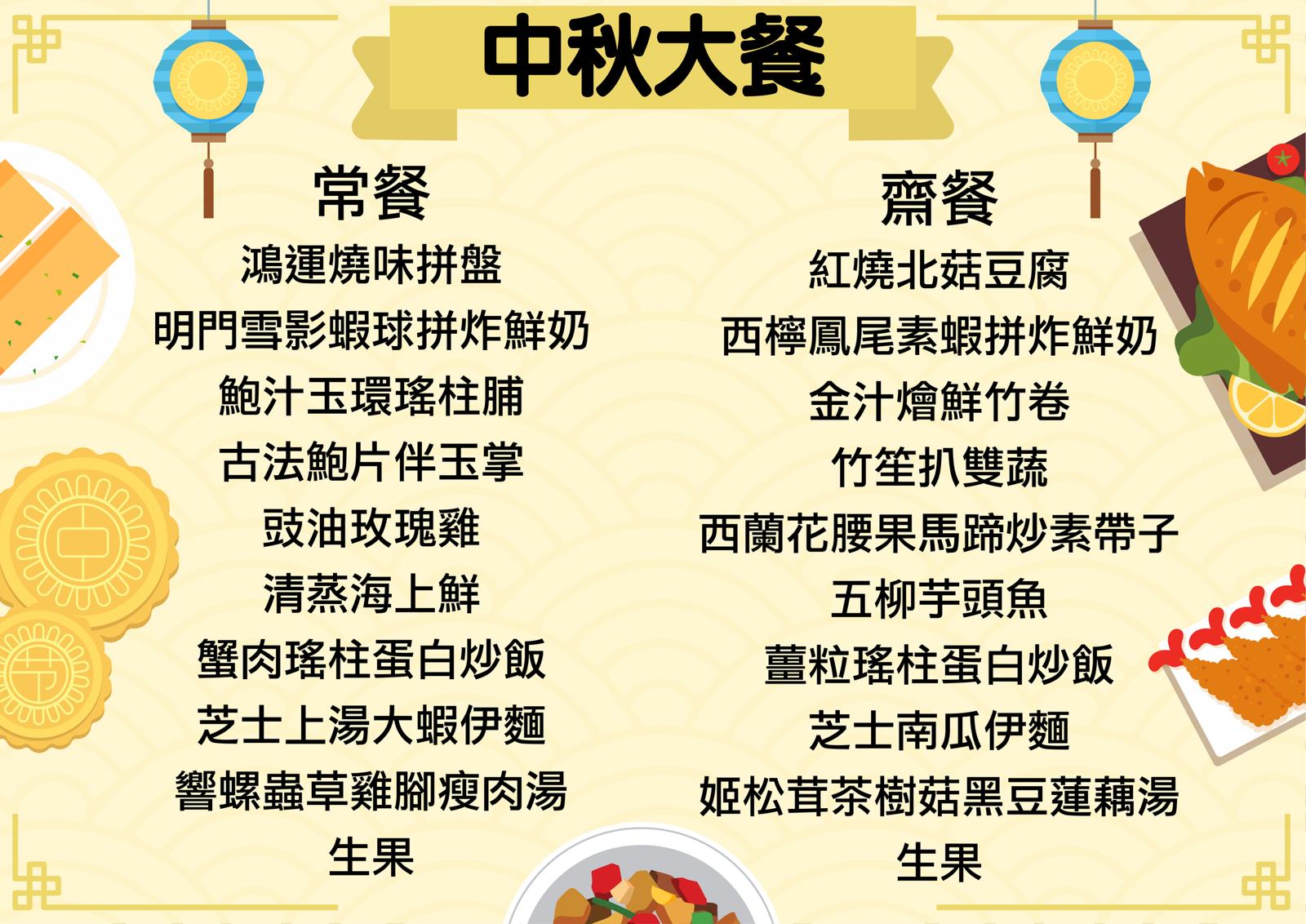 花好月圓人團圓,事事順利皆圓滿 為迎接中秋佳節的來臨,本院安排長輩共進中秋大餐 今年大餐菜式相當豐富,有燒味拼盤、有蝦球、有炸鮮奶、有鮑汁鵝掌、有雞又有魚,再配上鮮甜湯品,長輩們一邊食一邊豎起姆指,大讚「豐富好味」 本院亦為吞嚥困難的長輩預備精緻軟餐,共同感受節日的氣氛及歡樂 本院在此祝大家中秋節人月兩團圓,幸福樂綿延
